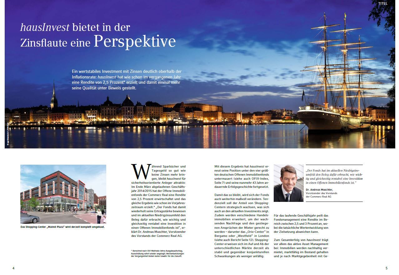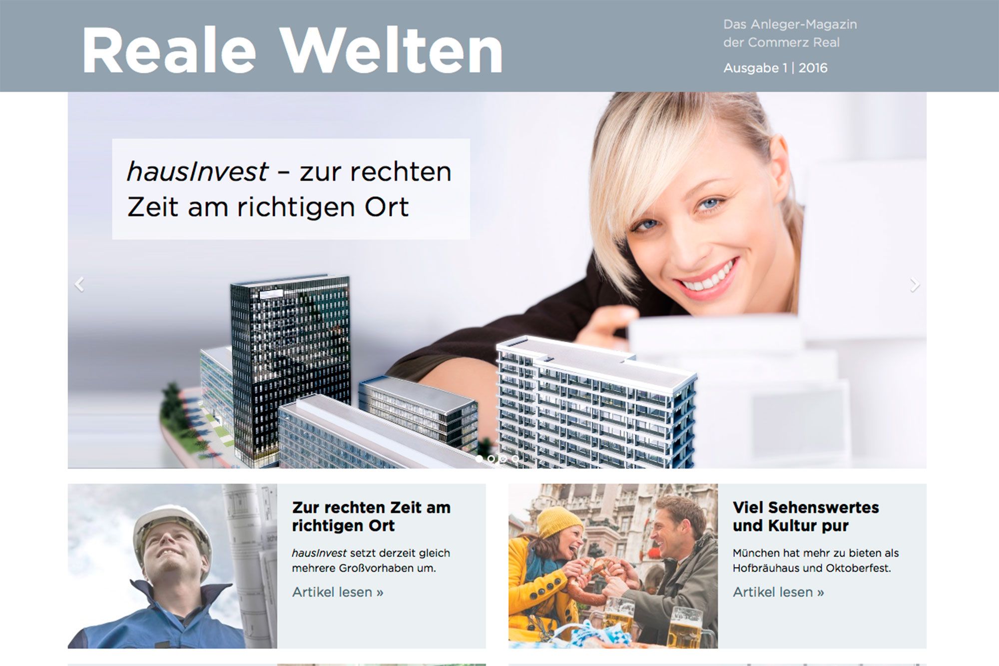 Das Anlegermagazin „Reale Welten“ richtete sich von 2007 bis 2017 an hausInvest-Anleger und jene, die es werden wollten. Die Auflage von 50.000 Exemplaren lag überwiegend in den Filialen der Commerzbank aus oder wurde im Kundengespräch eingesetzt. Das Magazin erschien zweimal pro Jahr. Es warf einen Blick hinter die Kulissen eines der größten Immobilienfonds Deutschlands, erläuterte aktuelle Entwicklungen und stellte besondere Immobilien im Portfolio vor. Wir haben sowohl für das Print-Magazin als auch für die Anfang 2015 gelaunchte Website die Texte recherchiert und erstellt.