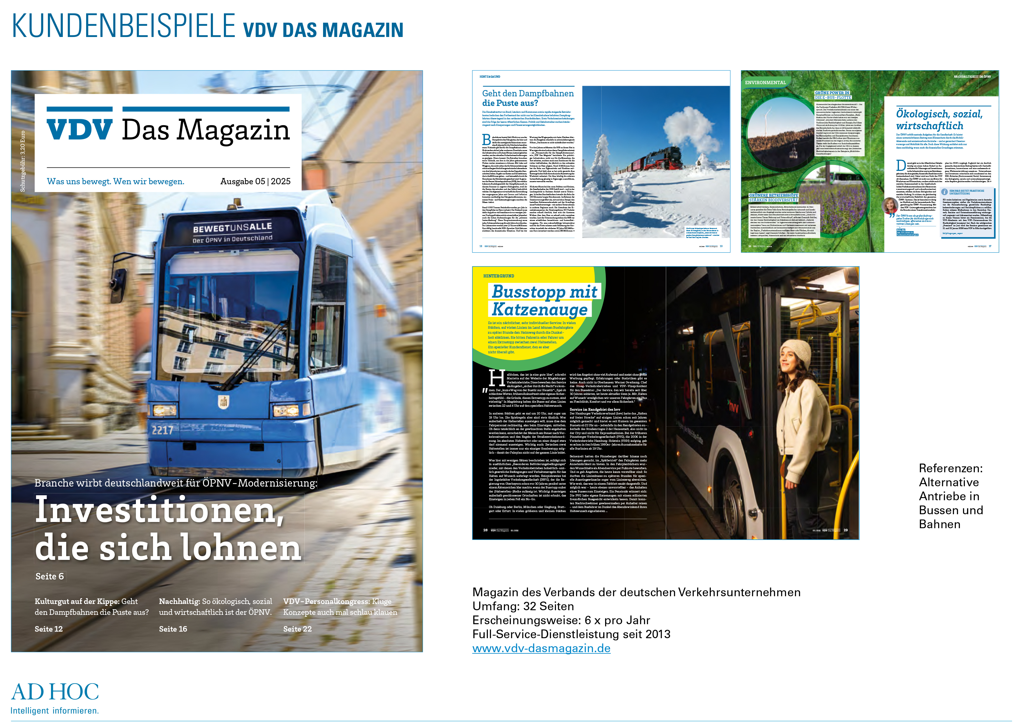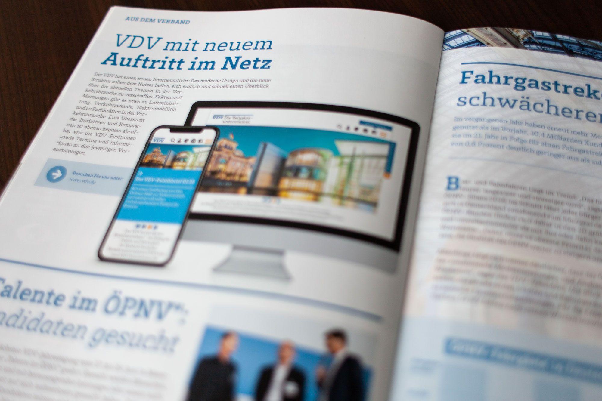 Seit Anfang 2013 produzieren wir das offizielle Magazin für den Verband Deutscher Verkehrsunternehmen (VDV). „VDV Das Magazin“ bietet den Unternehmen des ÖPNV sowie des Schienenpersonen- und des Schienengüterverkehrs eine redaktionelle Plattform. In Fachbeiträgen, Meldungen, Reportagen und Interviews deckt es alle Facetten des modernen Personen- und Güterverkehrs ab – vom Zustand der Infrastruktur über technische Innovationen bis hin zu Finanzierungsfragen. „VDV Das Magazin“ erscheint alle zwei Monate in einer Auflage von 5.100 Exemplaren. Es richtet sich an Multiplikatoren sowie Mitarbeiter und Entscheider in Verkehrsunternehmen, Verwaltung, Wissenschaft und Politik. Wir übernehmen die gesamte Redaktion und Gestaltung des Heftes in Abstimmung mit dem VDV. Seit Anfang 2017 erscheint jede Ausgabe darüber hinaus in einer eigens gestalteten Webversion, die mit zusätzlichen Informationen und Multimedia-Inhalten angereichert wird.