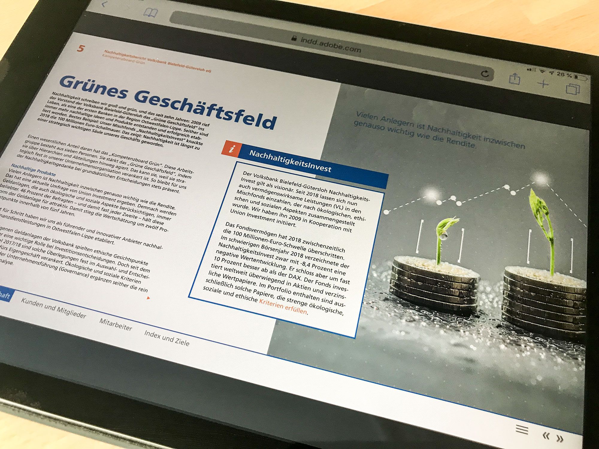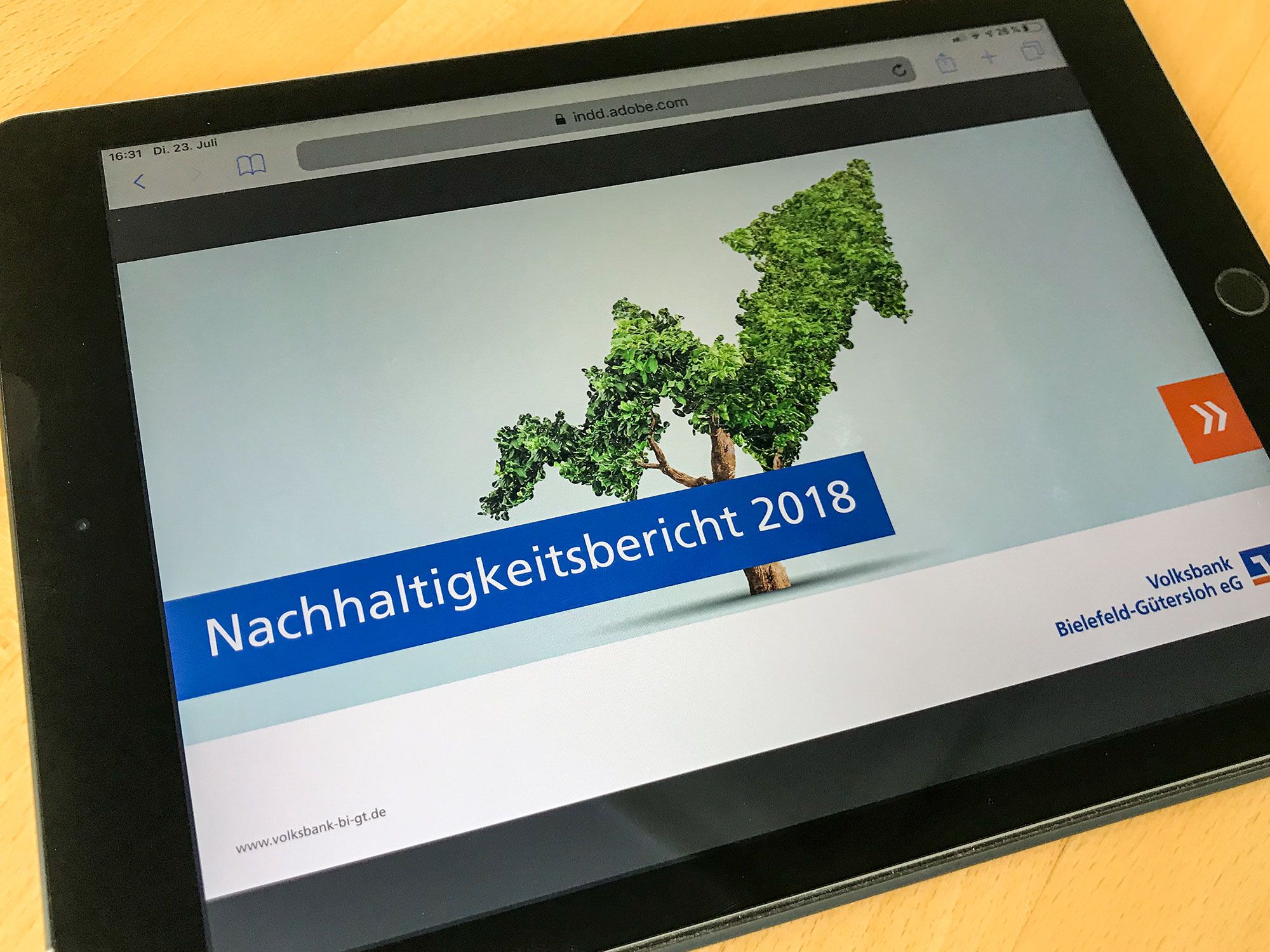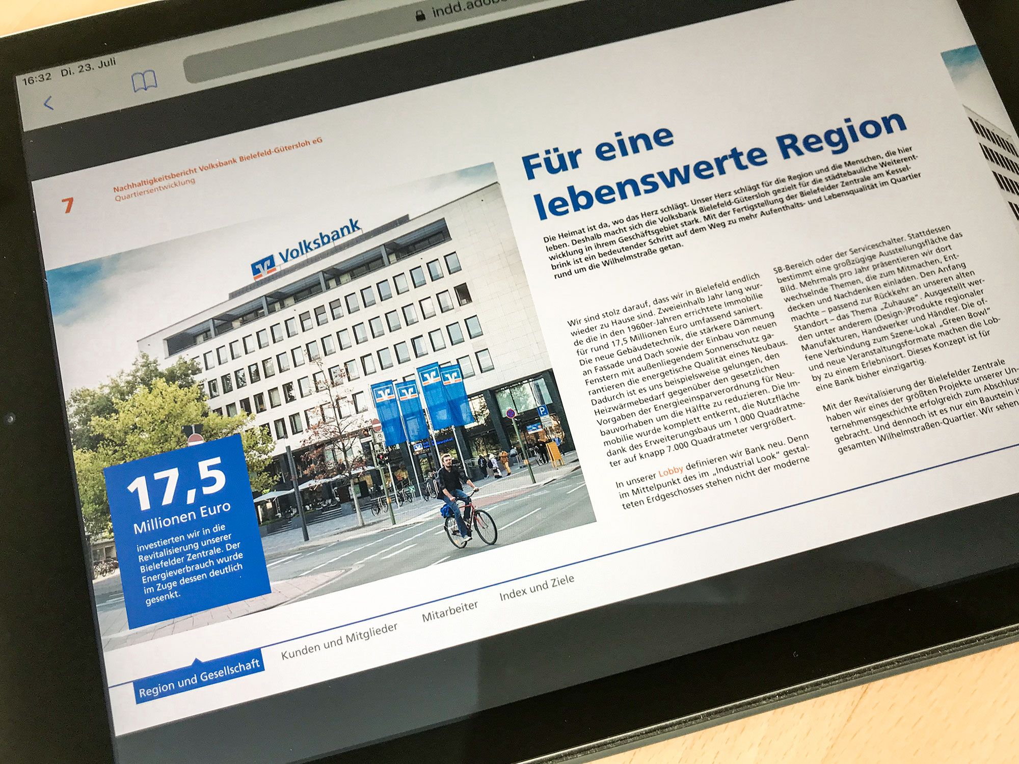 Außerdem haben wir für den Nachhaltigkeitsbericht der Volksbank Bielefeld-Gütersloh ein Format entwickelt, das „magazinig“ über das ökologische, soziale und gesellschaftliche Engagement informiert. In einem interaktiven PDF und einer für Smartphones optimierten Version wurden alle aussagekräftigen Kennzahlen anschaulich und leicht verständlich aufbereitet – mit vielen Fotos und interessanten Grafiken.